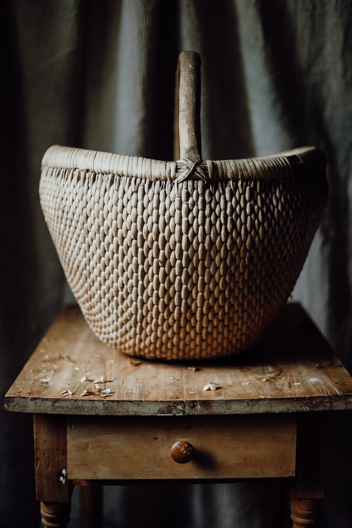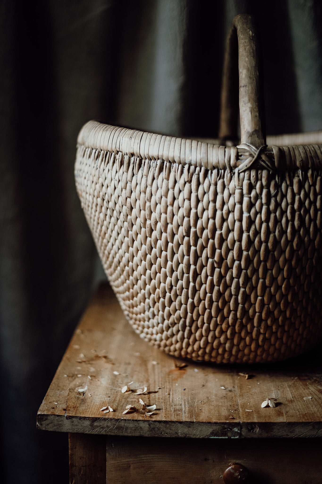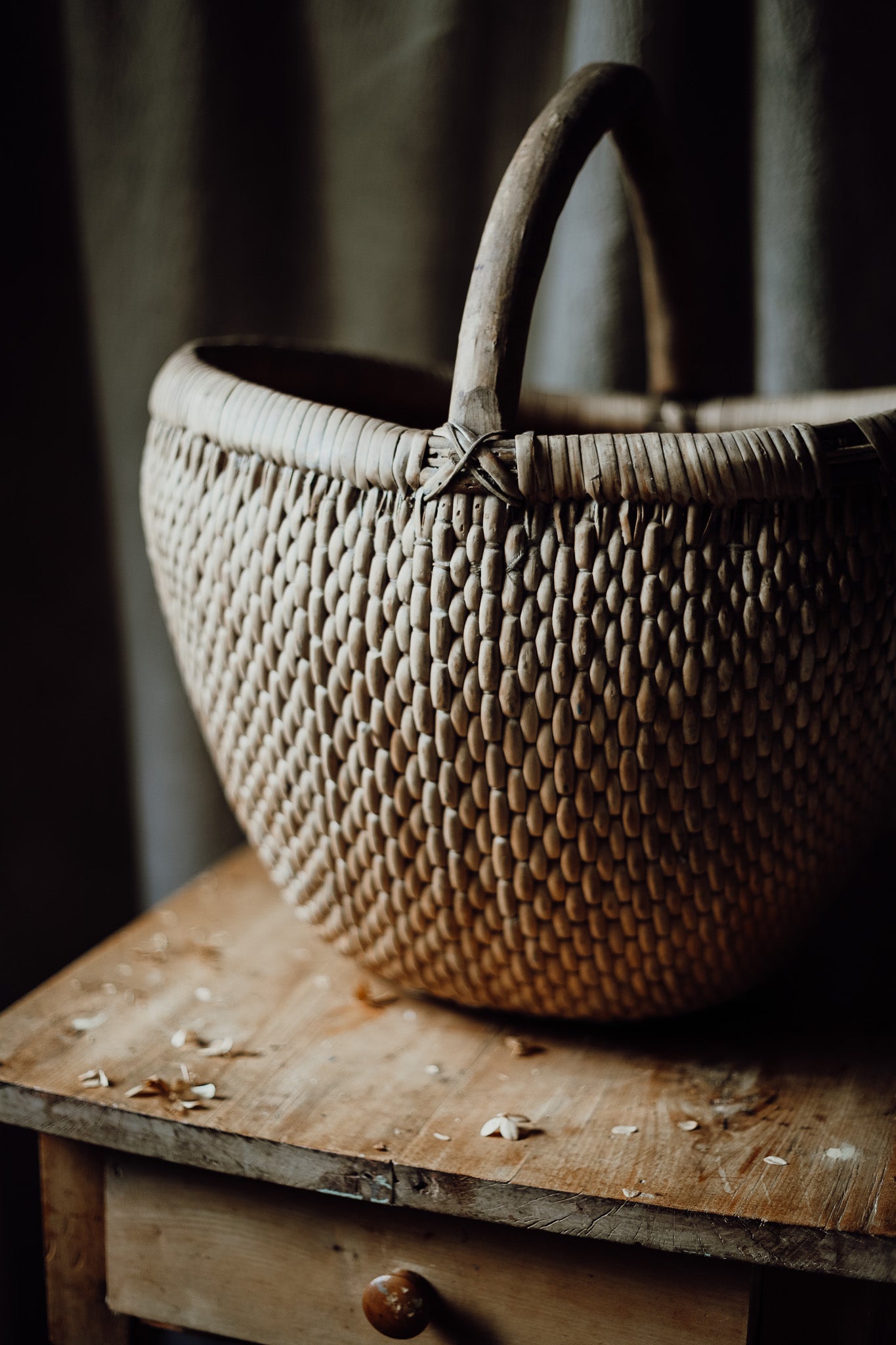Each piece is woven from natural willow and carries with it the subtle variations of age and use, making no two baskets exactly alike. The curved handle and organic form highlight the artistry of hand craftsmanship, while the weathered patina tells the story of its past.