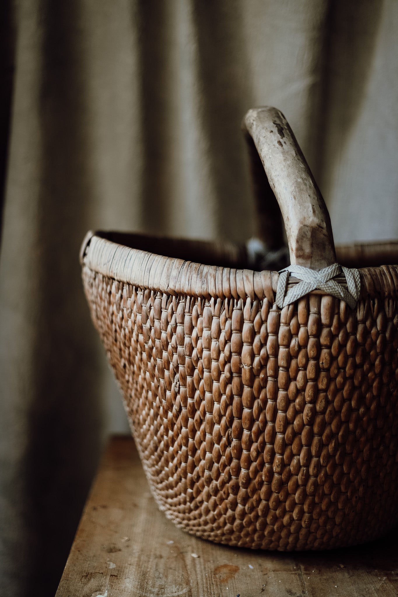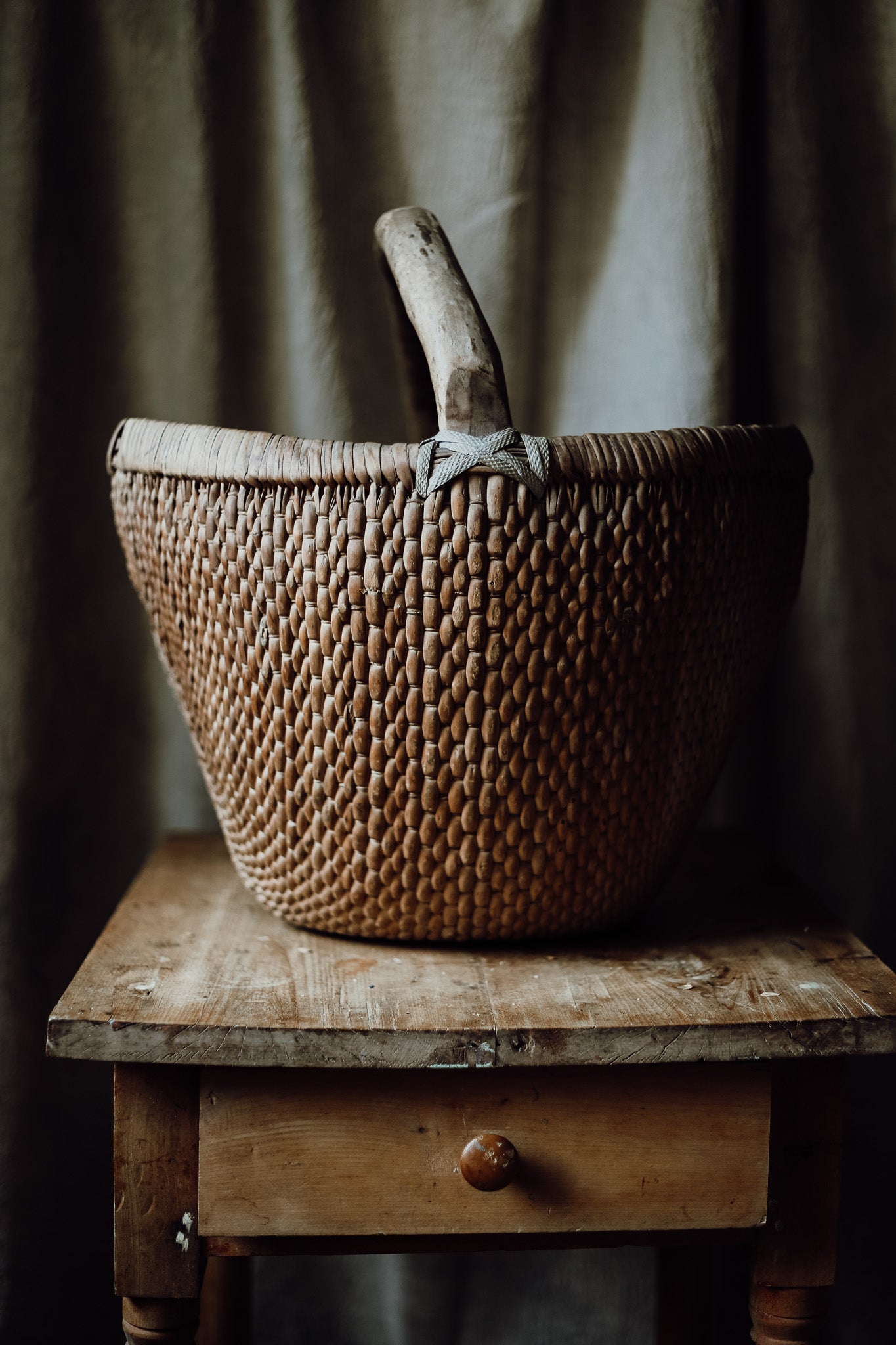 Each piece is woven from natural willow and carries with it the subtle variations of age and use, making no two baskets exactly alike. The curved handle and organic form highlight the artistry of hand craftsmanship, while the weathered patina tells the story of its past.