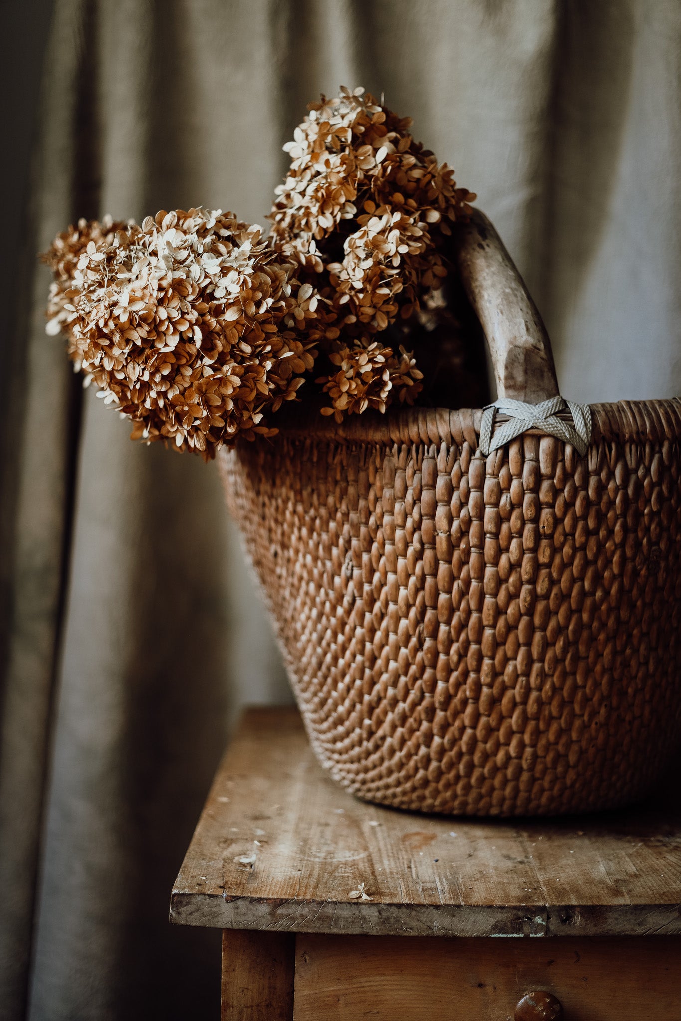 Perfect for display or practical styling—whether filled with dried flowers, textiles, or simply admired as an object of beauty—this basket captures the rustic elegance of everyday life made by hand.