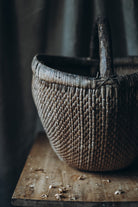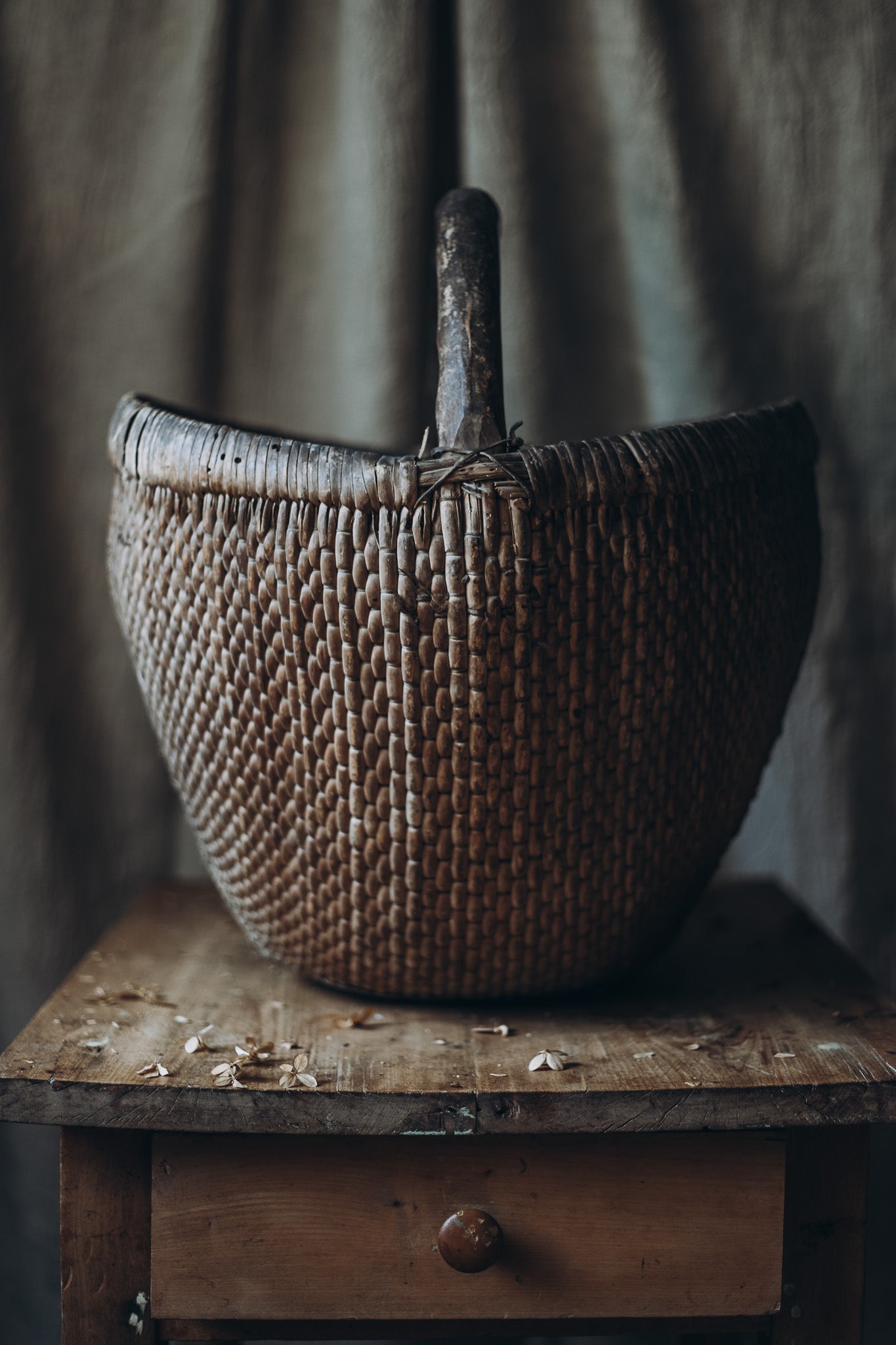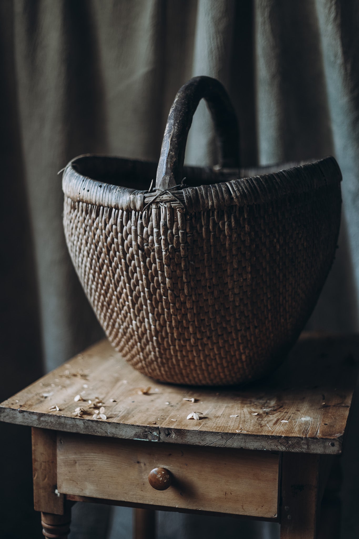 Each piece is woven from natural willow and carries with it the subtle variations of age and use, making no two baskets exactly alike. The curved handle and organic form highlight the artistry of hand craftsmanship, while the weathered patina tells the story of its past.
