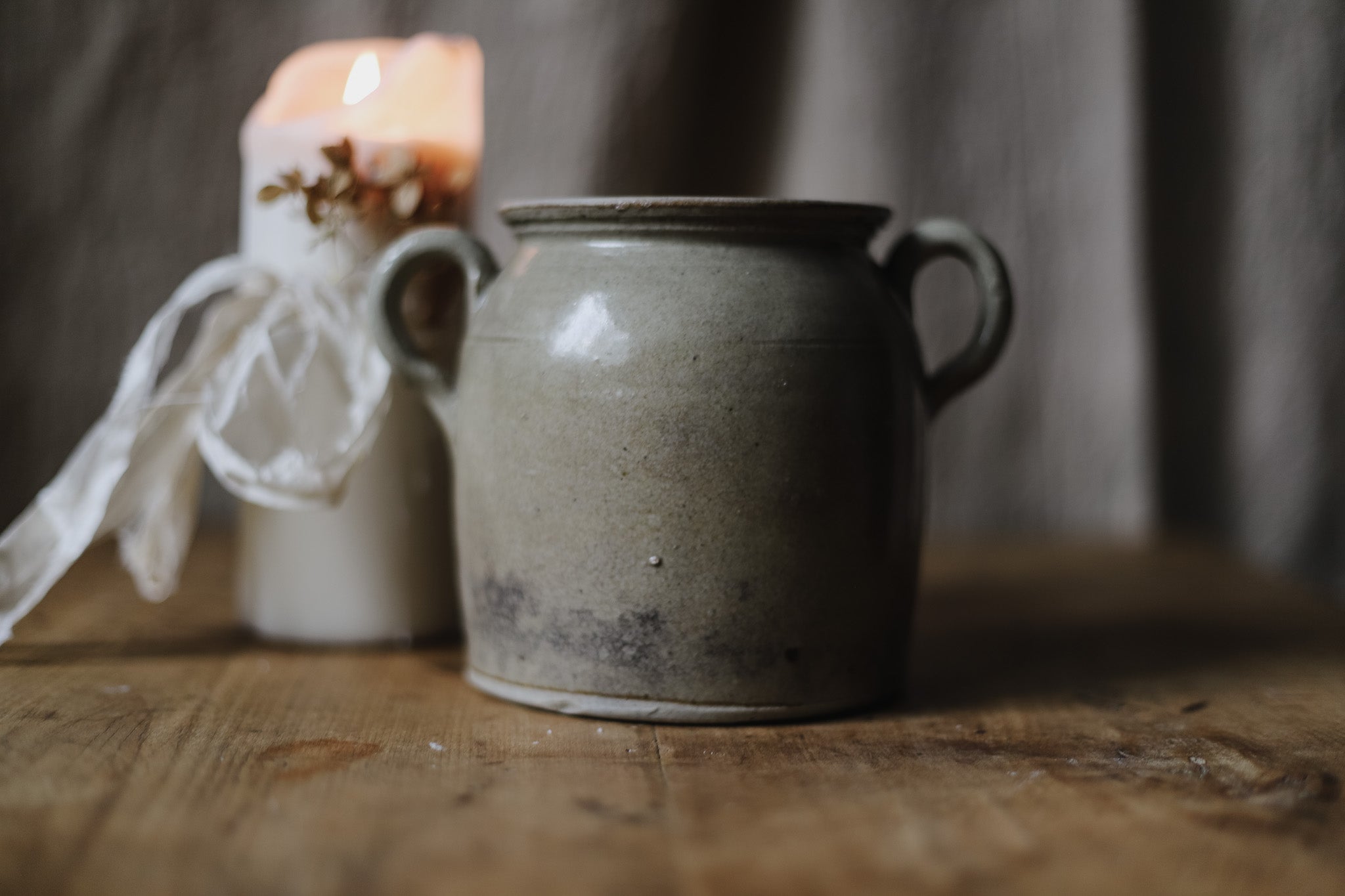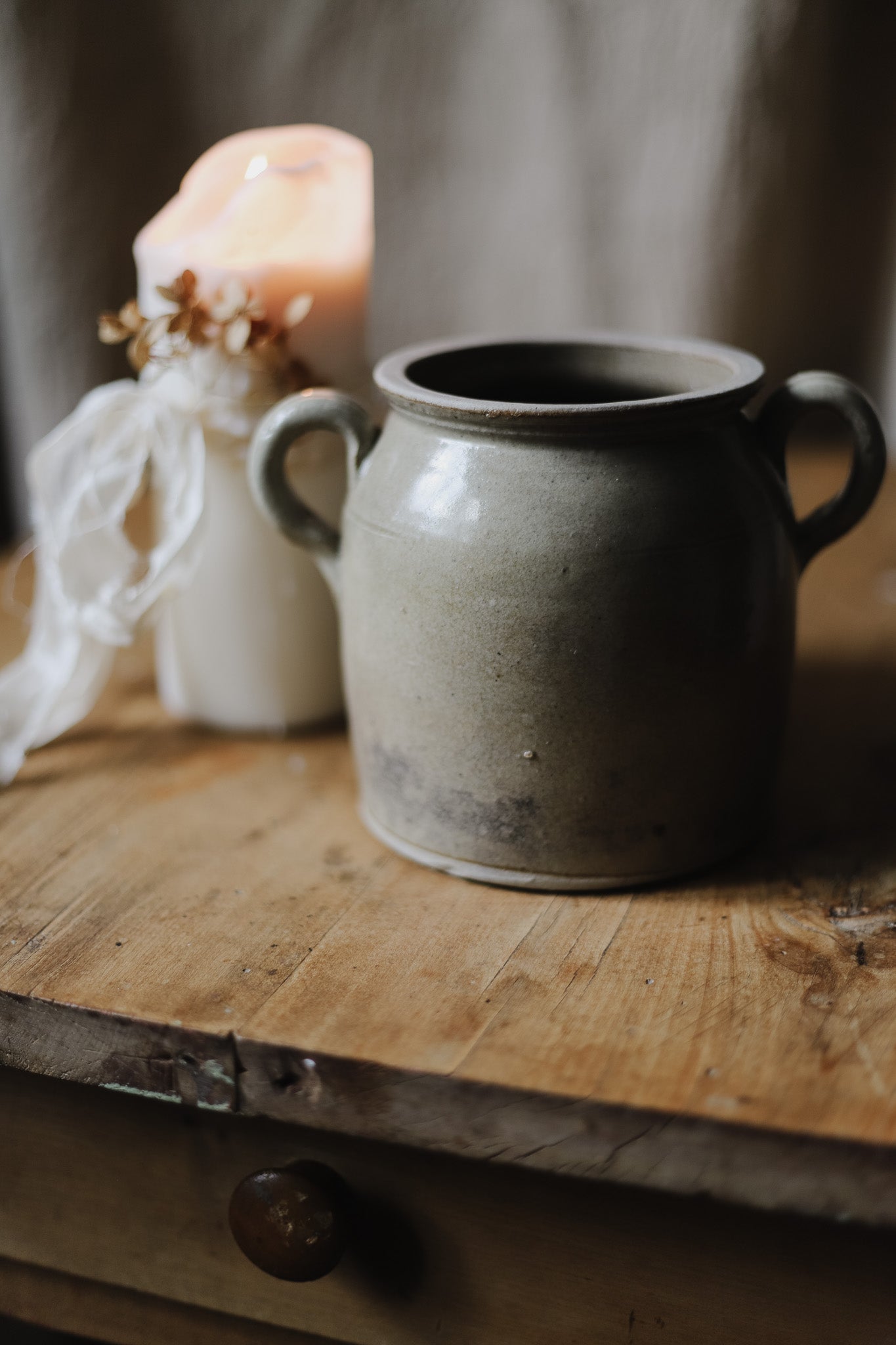 Exceptionally rare, this antique French confit pot features unique loop handles, a charming detail that sets it apart from traditional forms. Once used in provincial kitchens to preserve meats beneath a layer of fat, its warm glazed body and raw stoneware base reflect both utility and rustic elegance. The uncommon looped handles lend a sculptural quality, making it as decorative as it is historical. Perfect styled with branches, flowers, or admired on its own, it is a distinctive piece of French farmhouse pottery that celebrates heritage and timeless design.