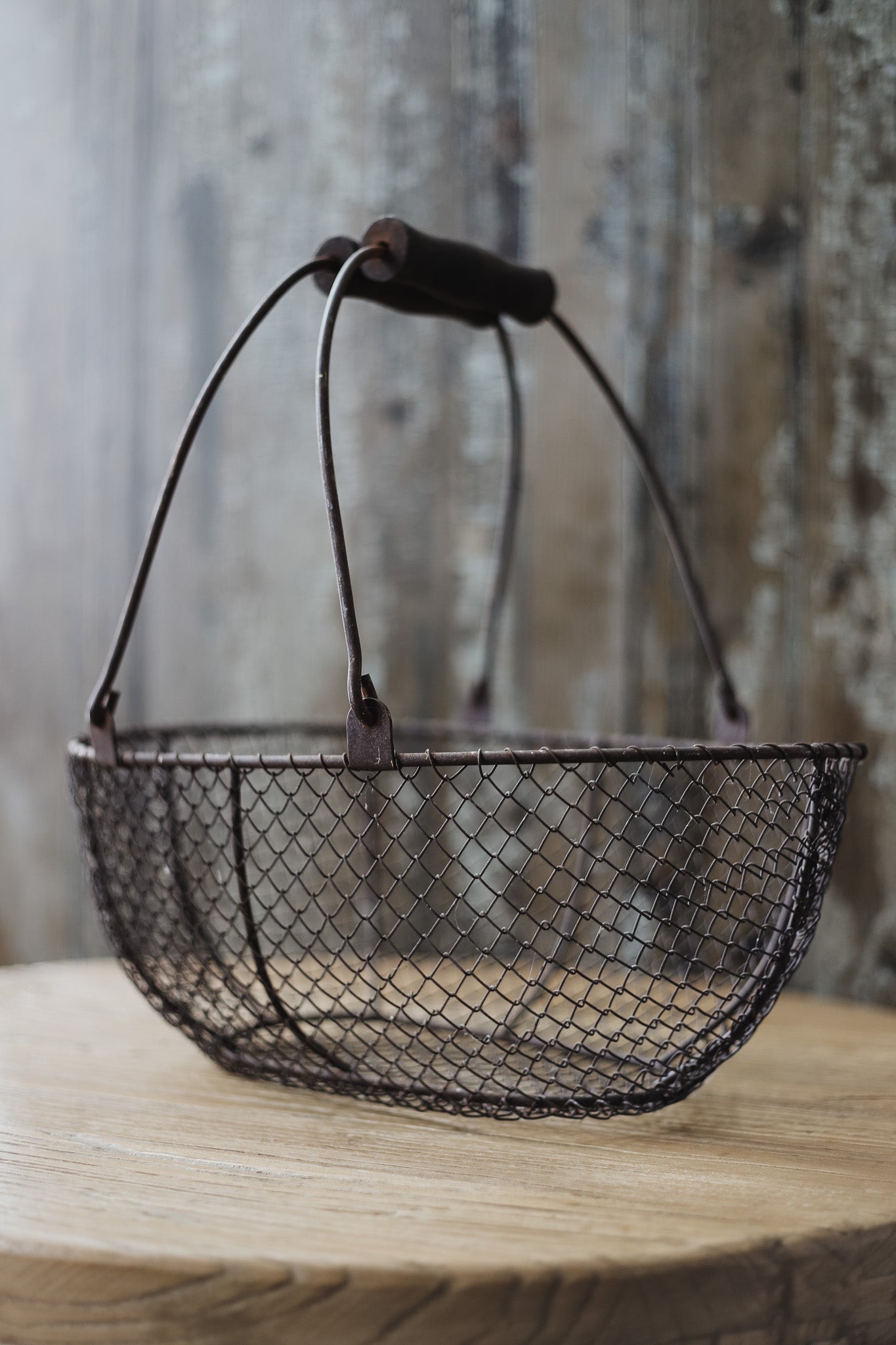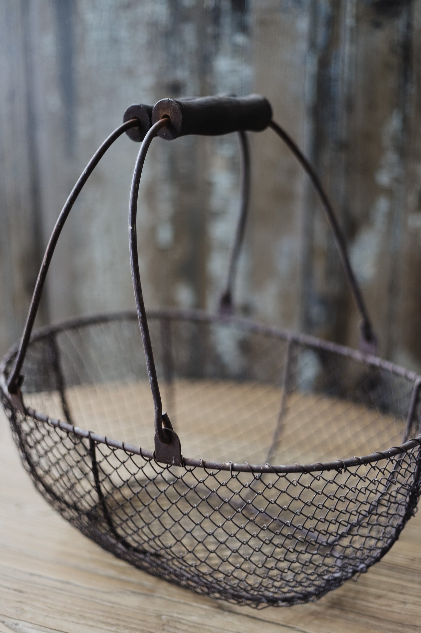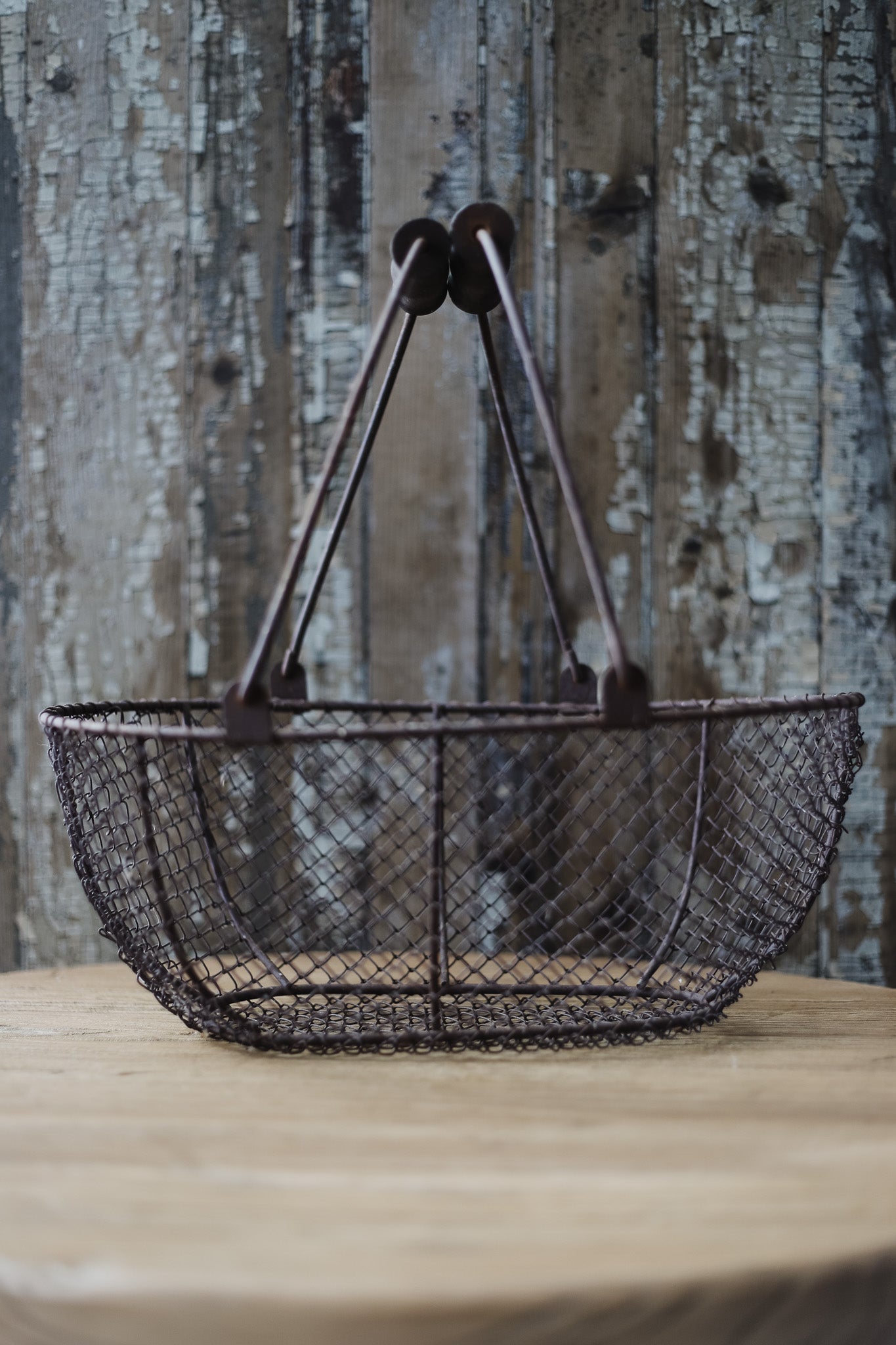 Capture the charm of rustic French countryside living with this antique handmade wire egg basket, complete with sturdy handles. This exquisite piece showcases traditional craftsmanship and provides a delightful way to gather and display eggs or other small items.