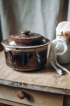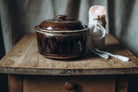 Rich in both form and function, this antique French casserole dish with its original lid showcases the soulful beauty of rustic brown glaze so beloved in provincial kitchens. Once used for hearty stews and family suppers, its gently worn surface and timeless silhouette speak to generations of French farmhouse cooking. A rare and practical treasure, it is as lovely styled on open shelving as it is cherished for use as a serving piece steeped in history.
