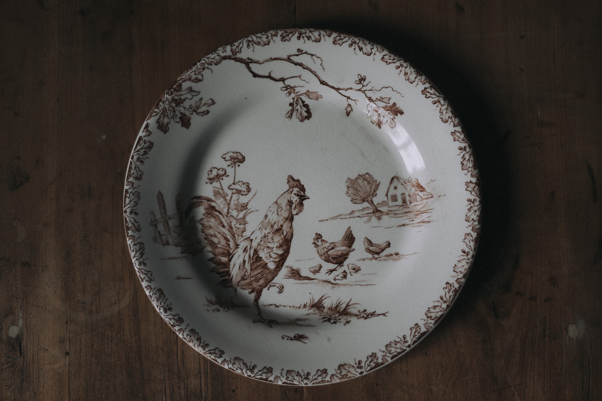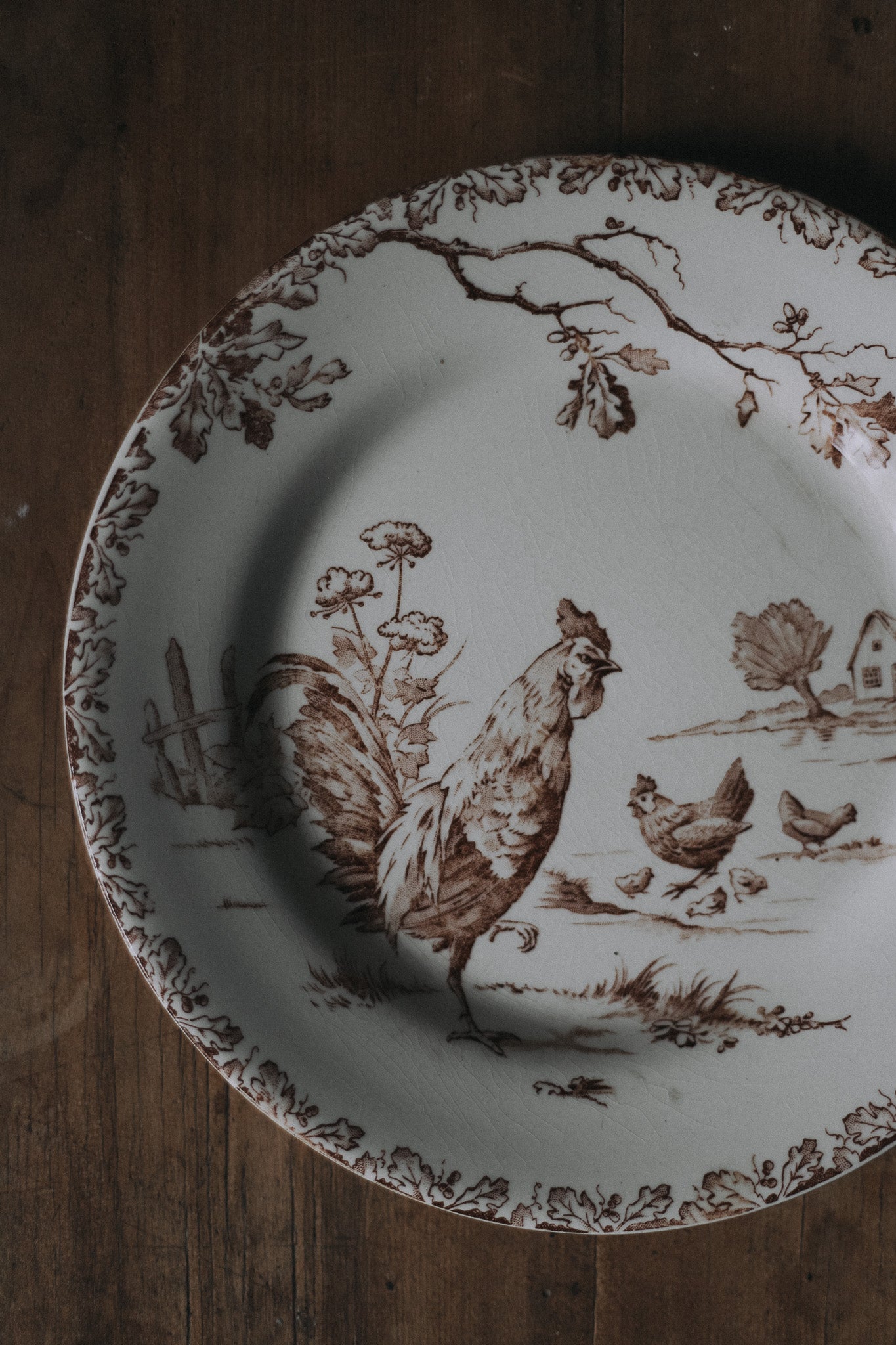 Charming and scarce, this antique French transferware plate features a beautifully detailed rooster in warm brown tones — a classic symbol of France and country life. Its delicate transfer design and softly aged glaze speak to rustic elegance once found on provincial tables. Perfect for collectors of French transferware or styled as wall décor in a farmhouse kitchen, it is a rare treasure that blends history, artistry, and the soulful charm of the French countryside.