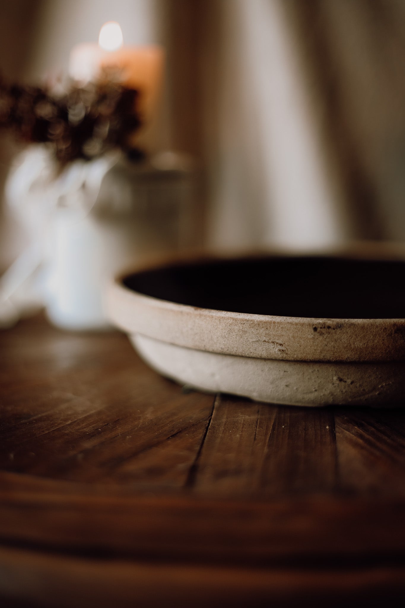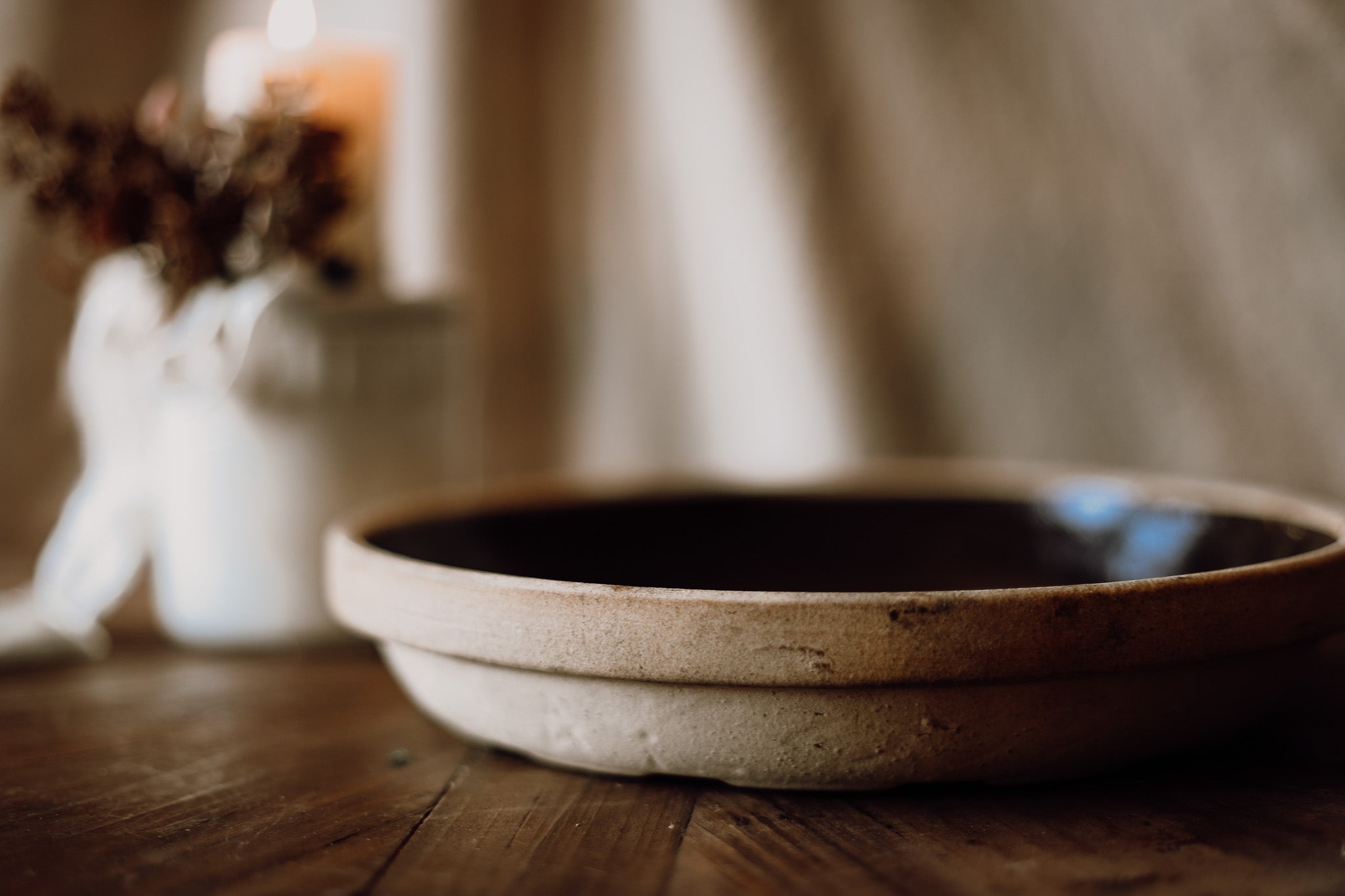 A charming vintage stoneware pie dish, expertly crafted with a classic scalloped design along the outside edge. The interior features a rich dark brown glaze, ideal for baking and presenting your favorite pies with timeless elegance. This piece showcases traditional craftsmanship and nostalgic appeal, perfect for both functional use and decorative display.