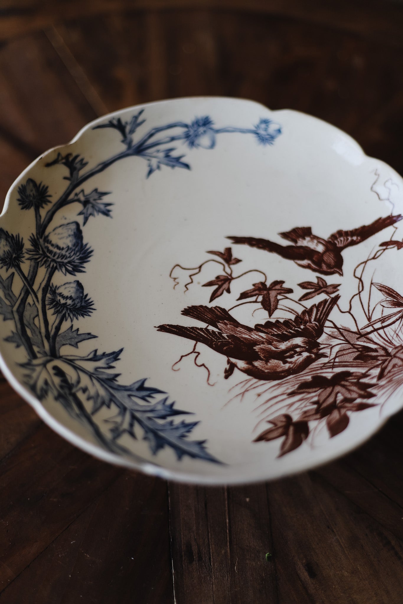 A breathtaking find for collectors and lovers of antique ironstone, this extremely rare French ironstone compote showcases stunning artistry with detailed images of birds and thistles. Featuring a vibrant blue and rich brown color palette, this piece exemplifies the exquisite craftsmanship and natural motifs often found in antique French pottery.