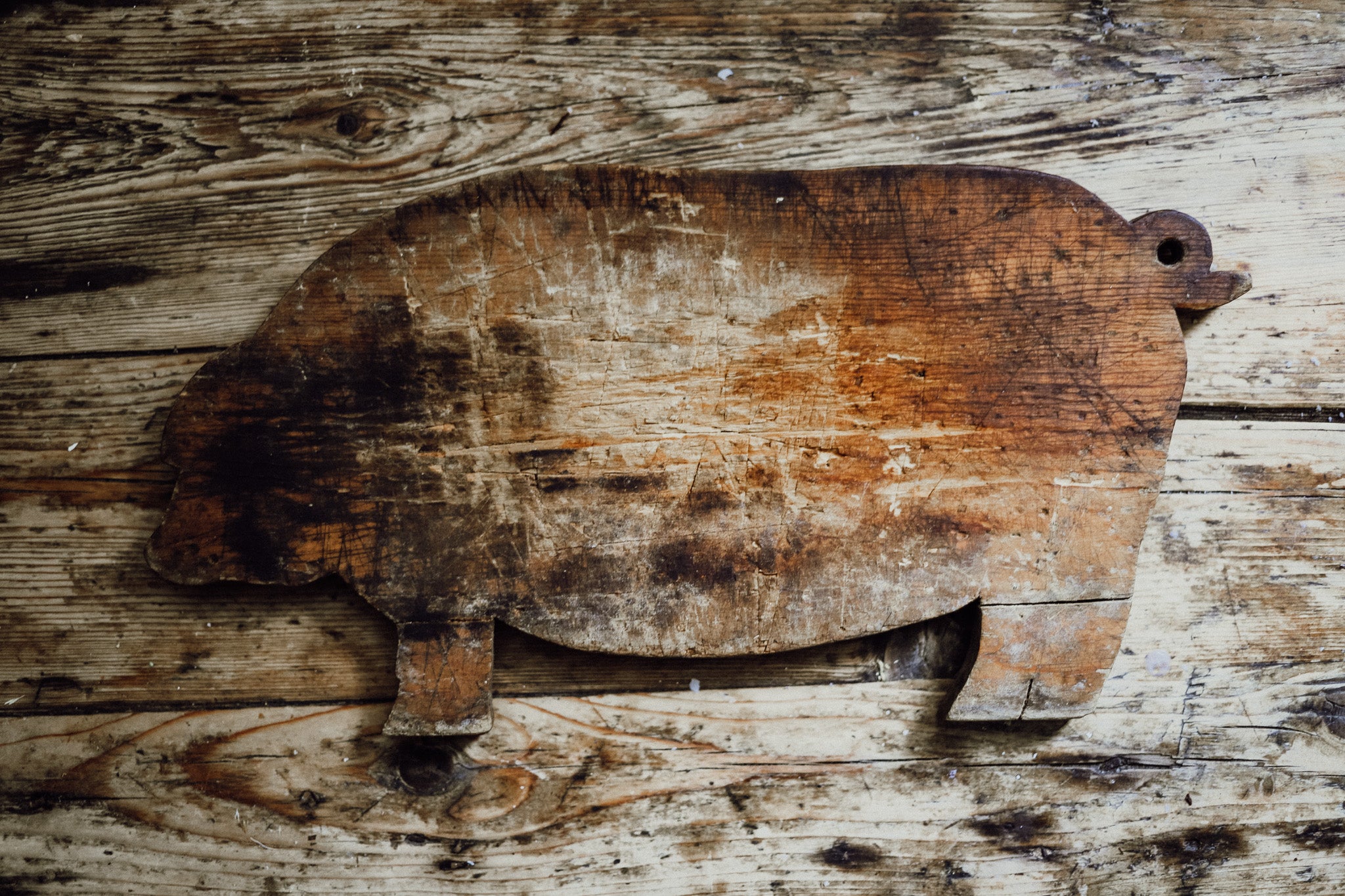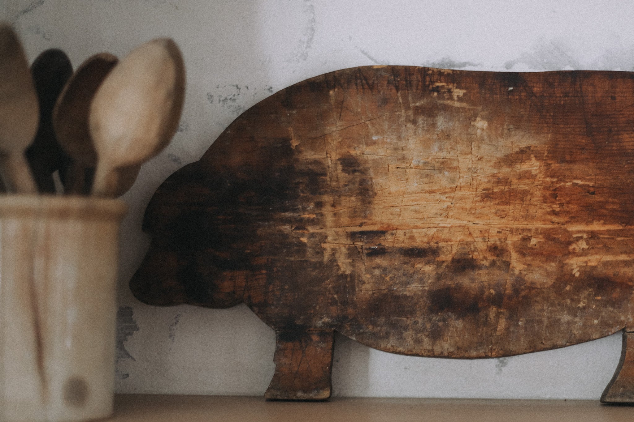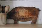 Full of rustic farmhouse charm, this antique American pig-shaped cutting board carries the warm patina of age and the marks of daily use. Once a beloved kitchen staple, its whimsical form reflects both utility and folk artistry, making it as decorative as it is functional. Styled leaning against a backsplash, hung on a wall, or layered into a vignette, it brings a touch of primitive American country décor and timeless character into the modern home.