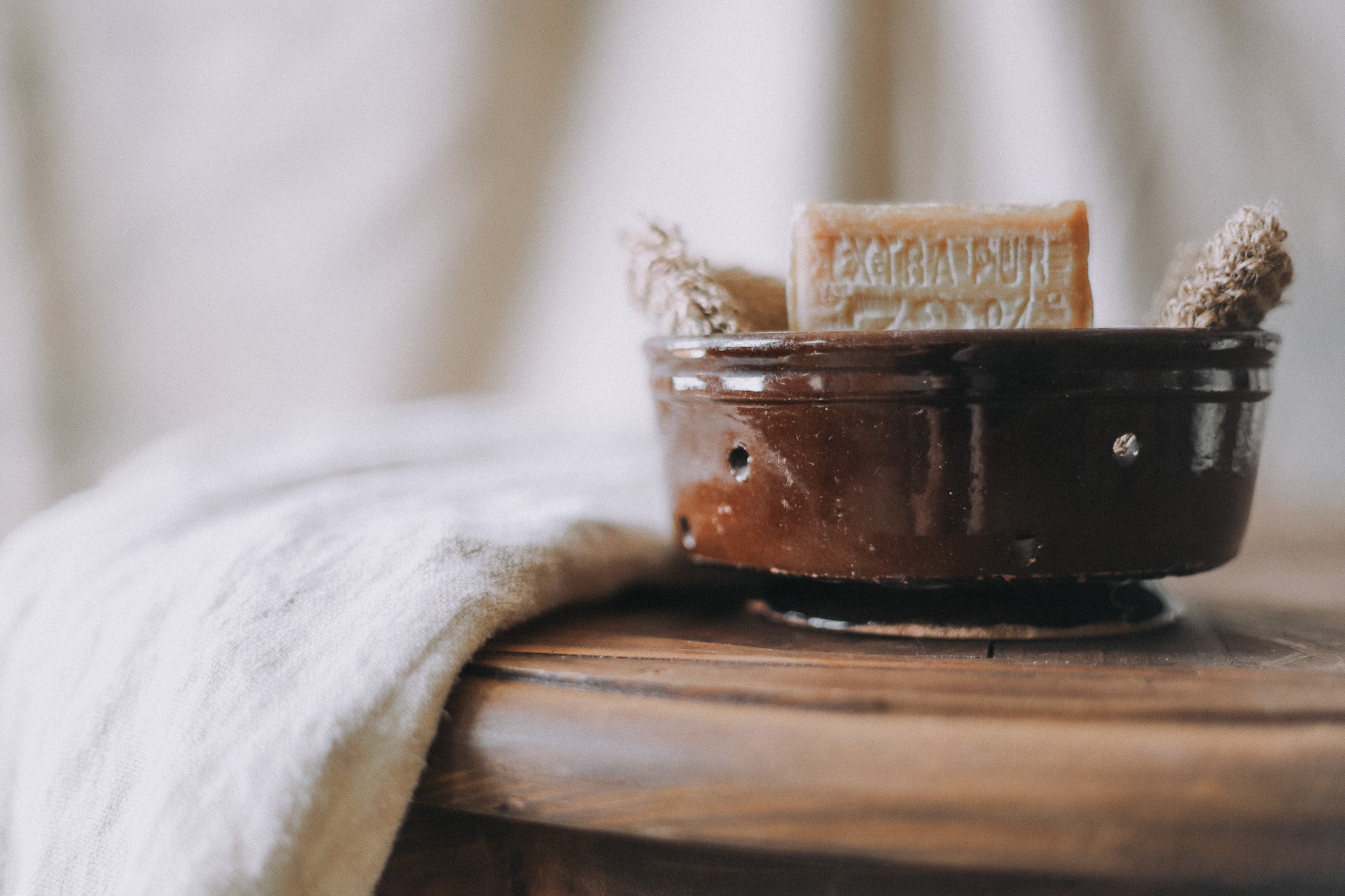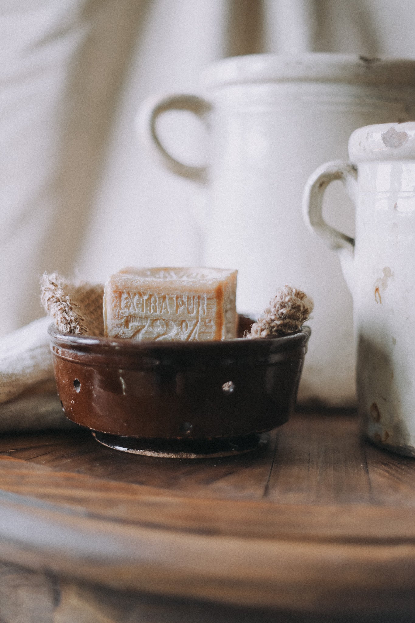 Bring a touch of French rustic charm to your home with this authentic vintage faisselle—a traditional French cheese dish—featuring an ornate pedestal base. Crafted from terracotta, this elegant piece showcases classic French design and craftsmanship. The set also includes an authentic French Marseille coconut oil soap and wash mitt, making it a charming and functional addition to your bathroom vanity or kitchen.