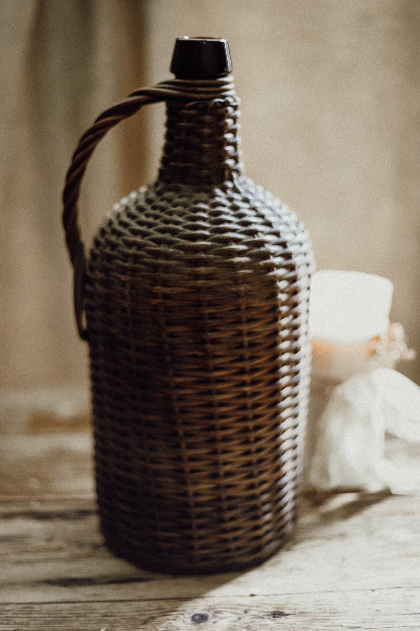 Steeped in rustic character, this antique French wicker-covered demijohn in dark brown once held wine or cider, carried from vineyard to cellar in the heart of the countryside. Its rich patina and tightly woven wicker speak to generations of use, while its sculptural form makes it a striking decorative piece today. Beautiful styled on its own, grouped with other bottles, or placed in a farmhouse kitchen or garden room, it is a soulful example of French provincial antiques — both practical and poetic.
