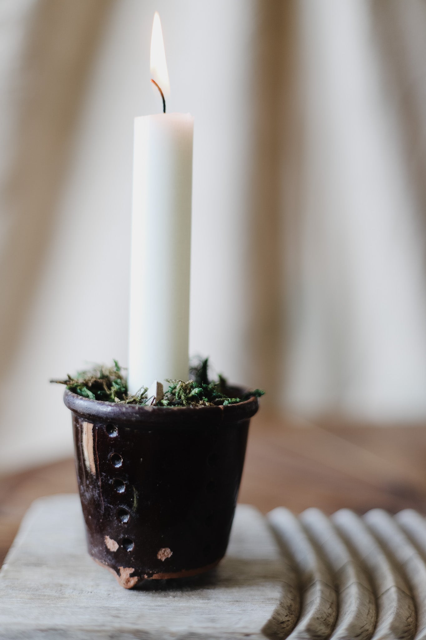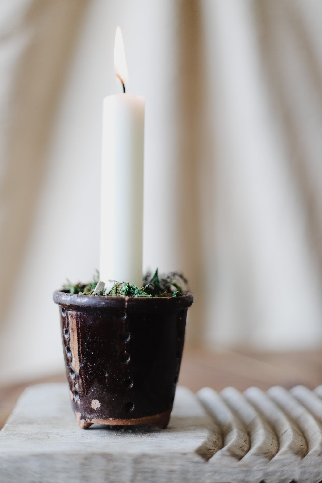 Create a cozy, rustic ambiance with this charming dark brown footed faisselle. Crafted from terracotta, this vintage French dish features an elegant footed design that adds height and style. Accentuated with dried moss and paired with a softly glowing candle, it makes a beautiful centerpiece or decorative accent for your home or garden.