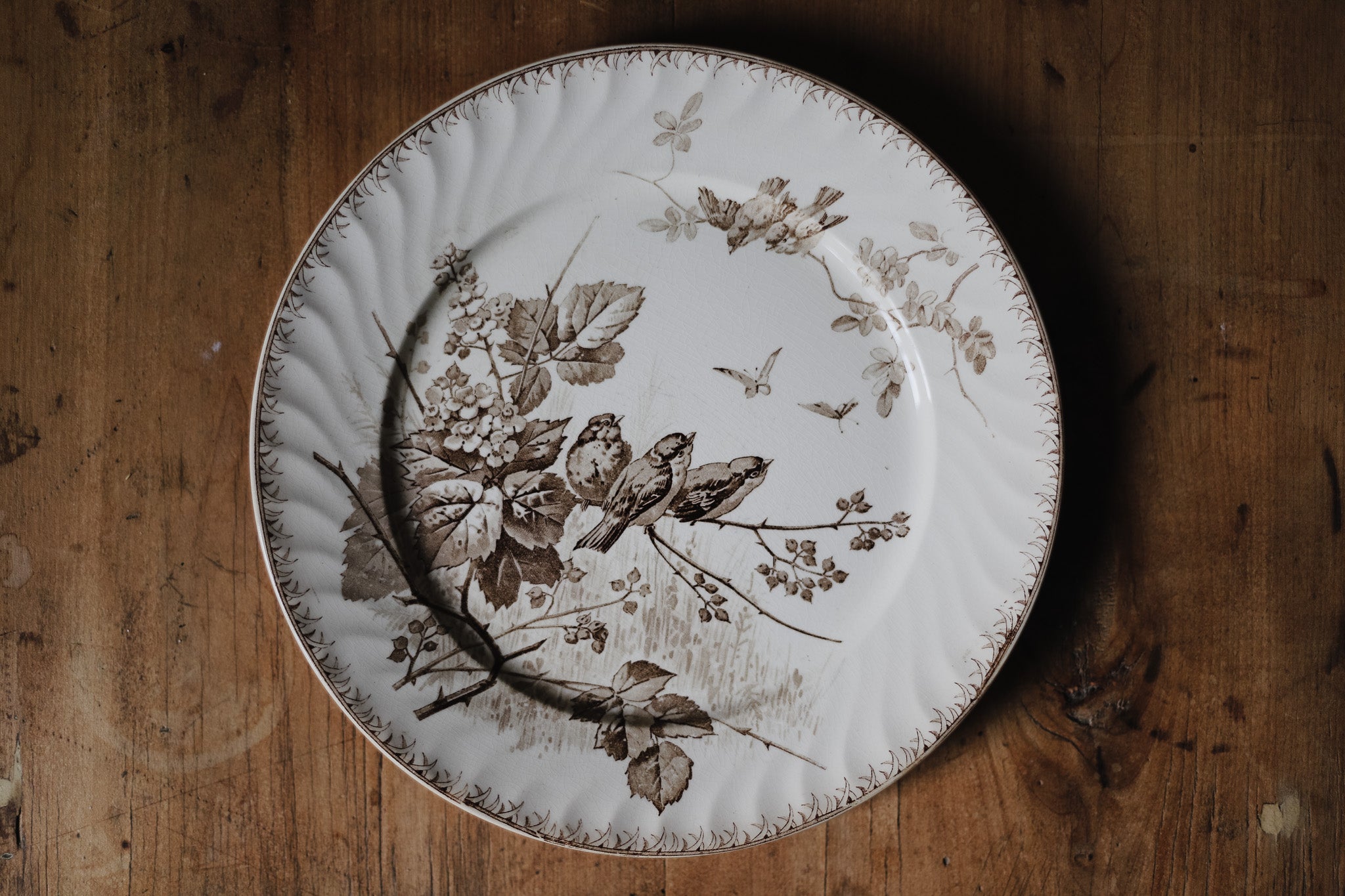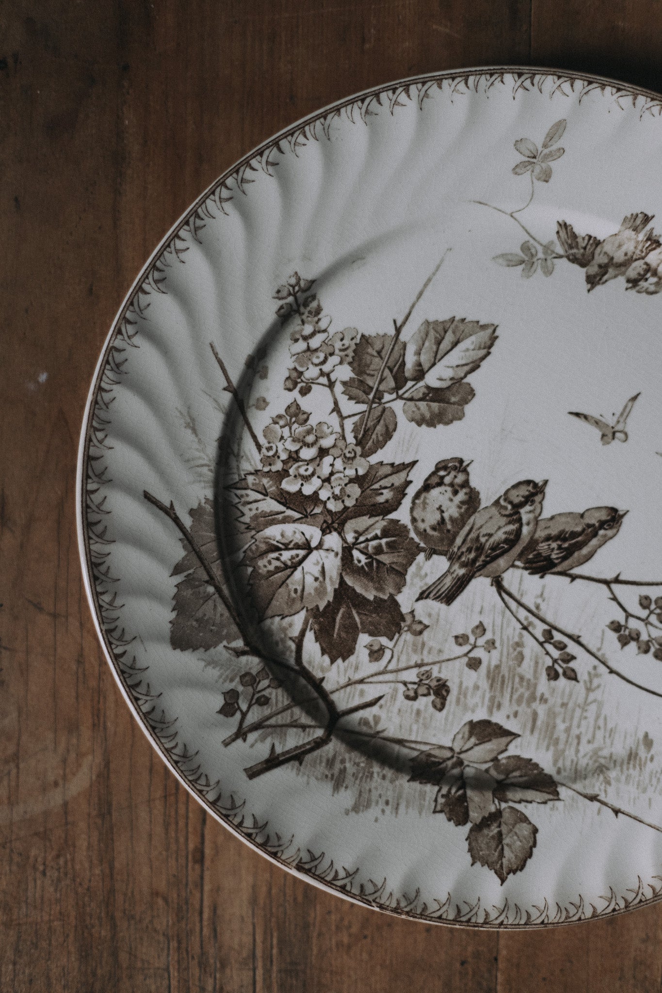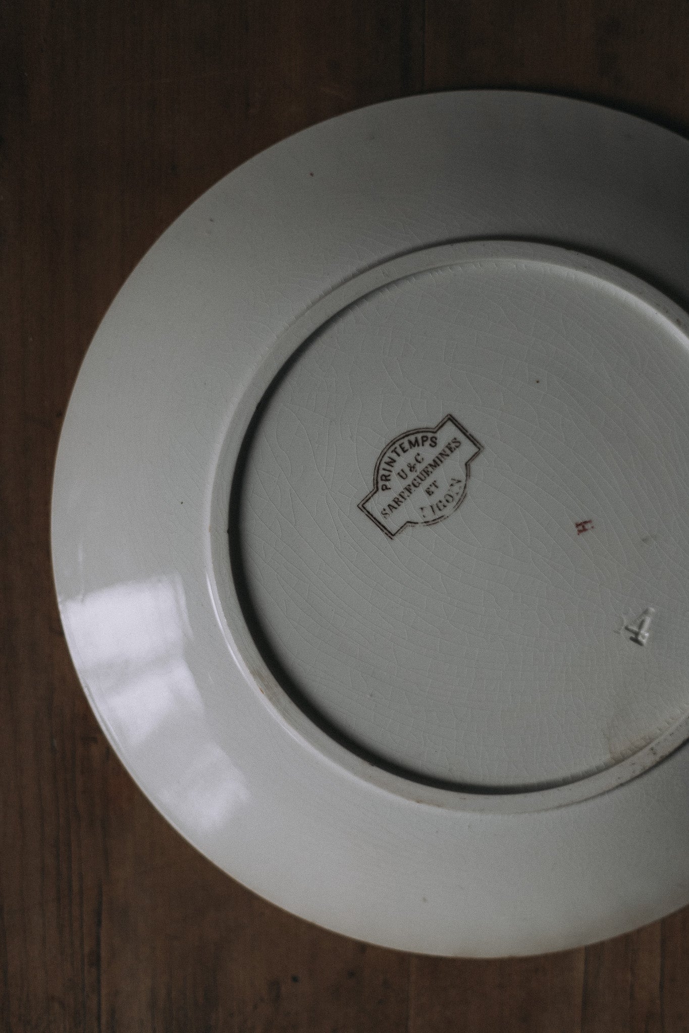 Extremely rare and exquisitely detailed, this antique French plate features the sought-after Printemps pattern, a beloved design that celebrates the grace of nature. Once gracing provincial tables as a small serving dish for hors d’oeuvres or accompaniments, its delicate transferware motif and softly aged glaze reflect both refinement and history. A true collector’s treasure, it is a striking piece of French transferware — perfect for display on open shelving, styled with other ironstone, or cherished as a timeless accent of French farmhouse tableware.