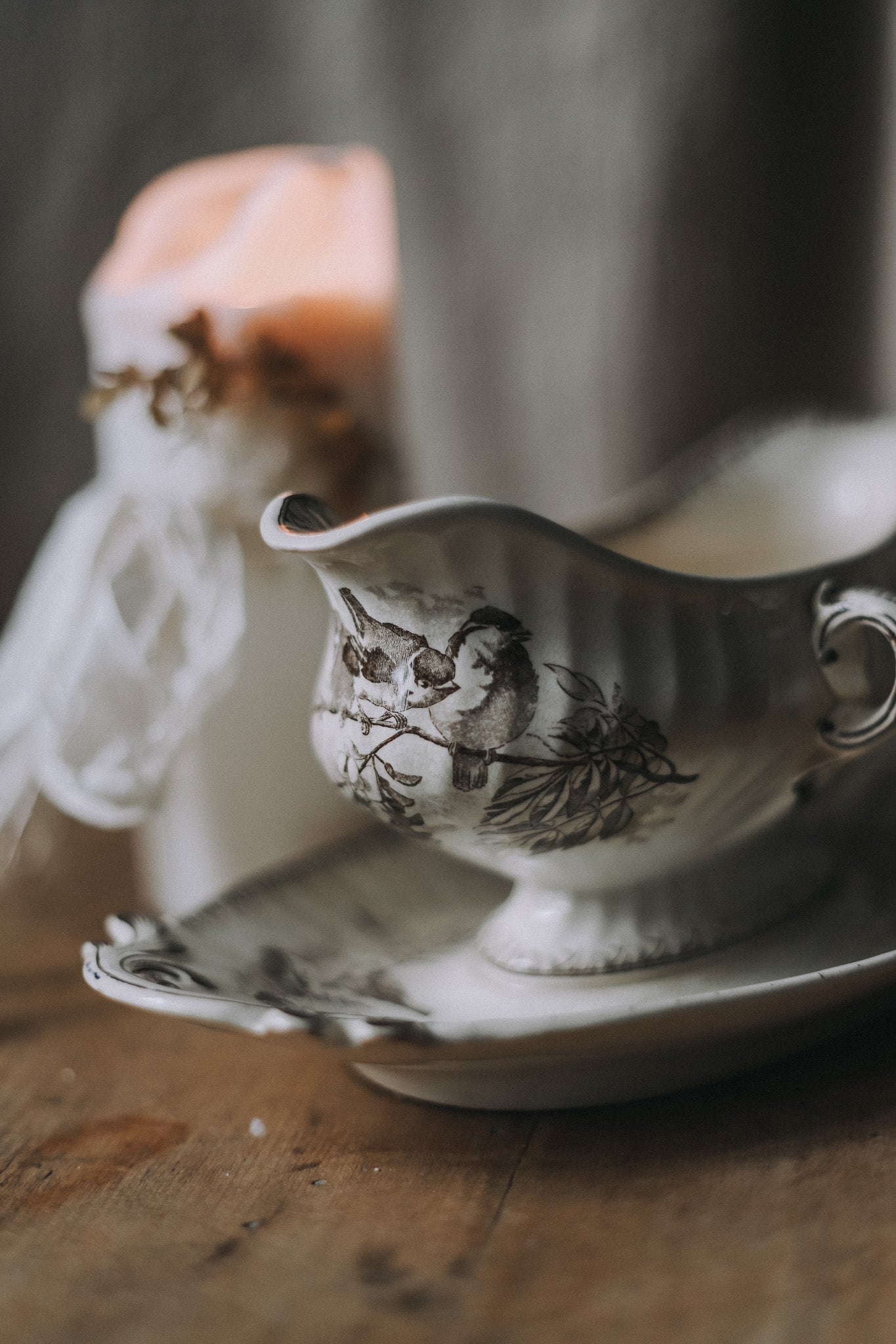 A rare and refined treasure, this antique French ironstone saucier features the sought-after Printemps pattern by Sarreguemines, beautifully decorated with a brown bird transfer. Once gracing the French table in the late 19th century, its graceful curves and delicate design embody both elegance and history. The softly aged glaze adds to its charm, making it a striking piece for collectors of French transferware or a soulful accent styled on open shelving, a sideboard, or as part of a curated tablescape. A timeless example of French provincial tableware, it carries the romance of everyday dining in old France.