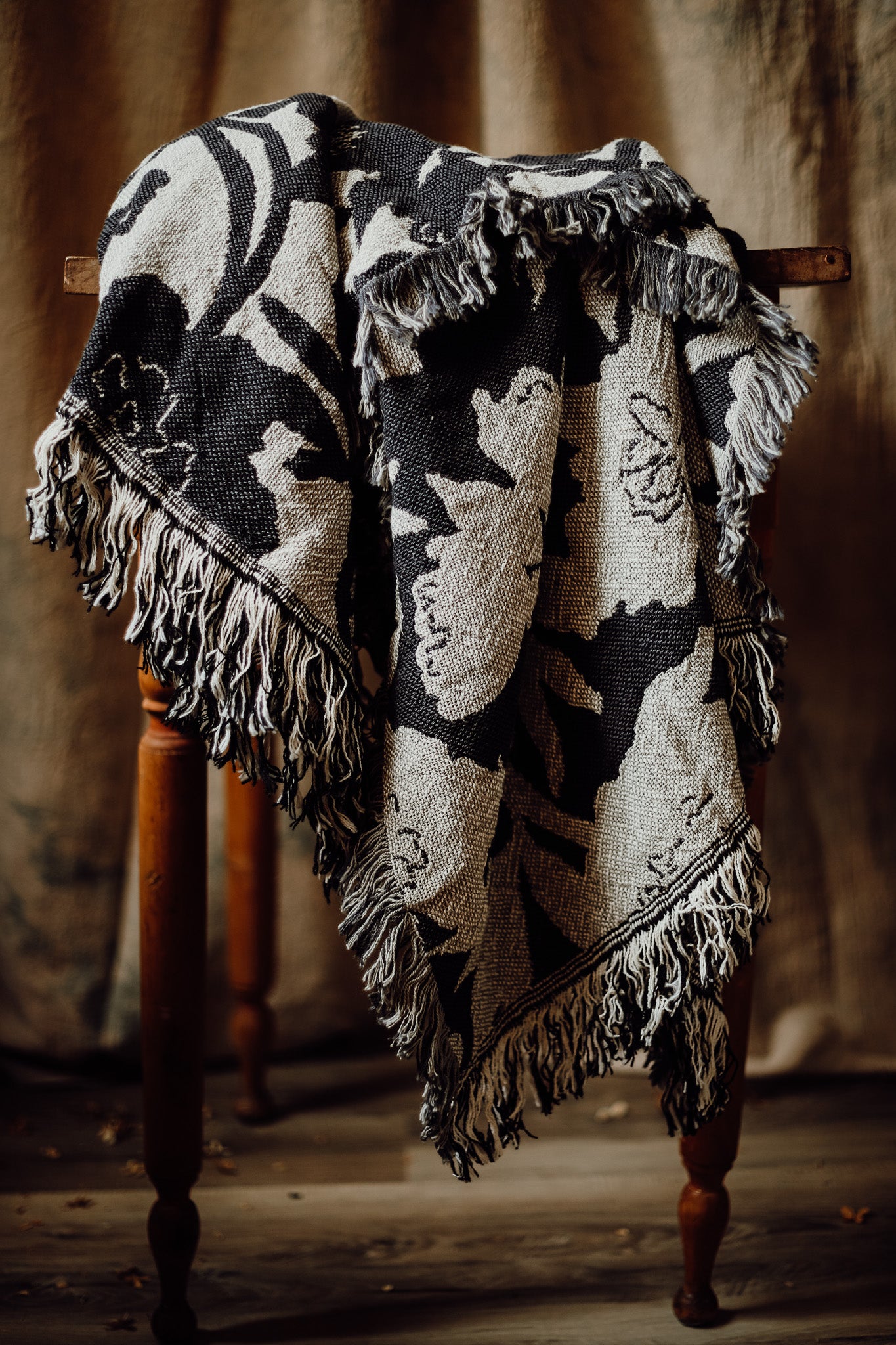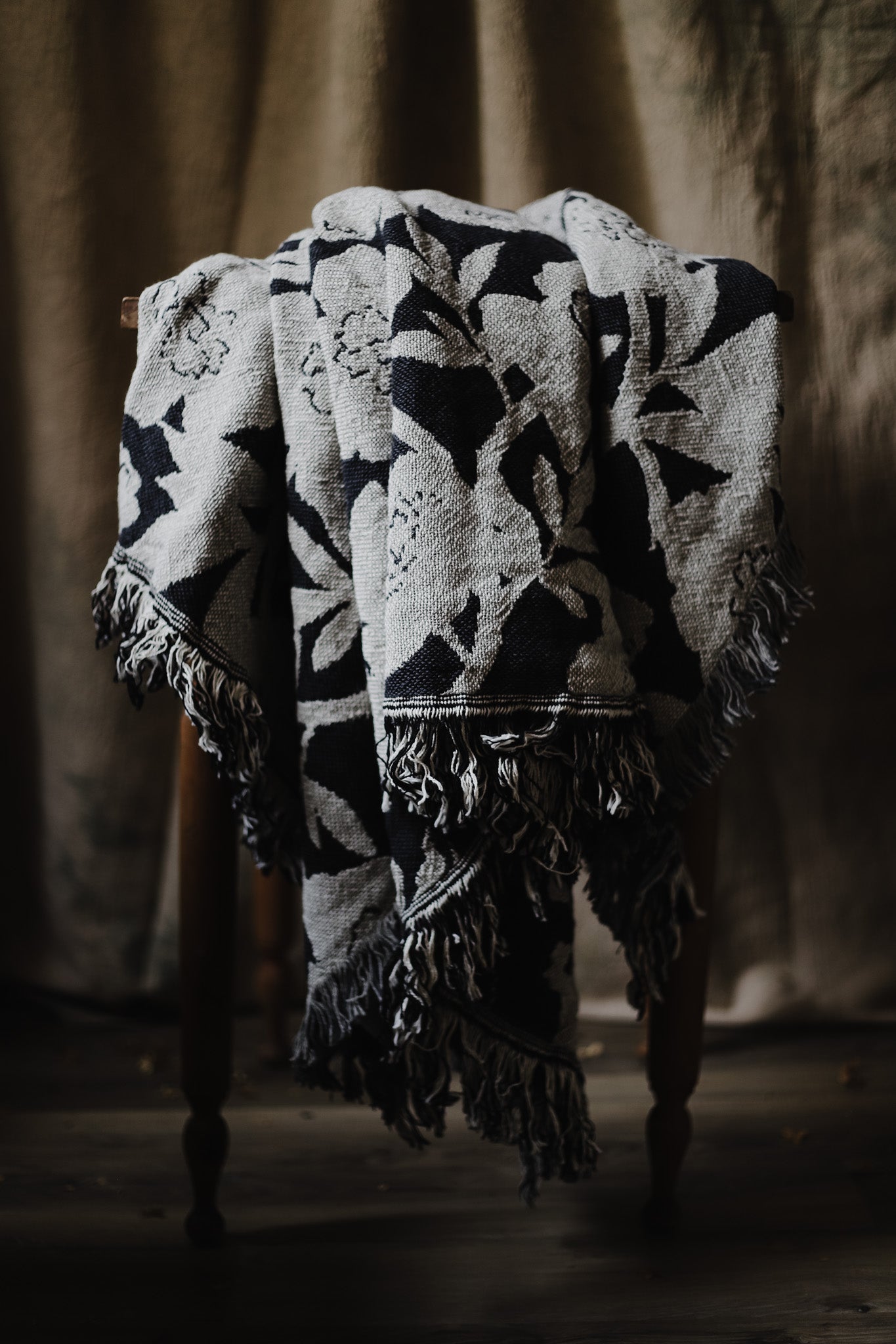 Warm and inviting, this reversible handmade throw features a gorgeous black floral pattern that brings both charm and versatility to your home. Expertly crafted with care, it offers two looks in one — a richly patterned side for a bold statement and a softer reverse for effortless layering. Perfect draped across a sofa, folded at the foot of a bed, or styled in a favorite reading chair, it blends beautifully with French farmhouse décor, adding texture, color, and timeless coziness.