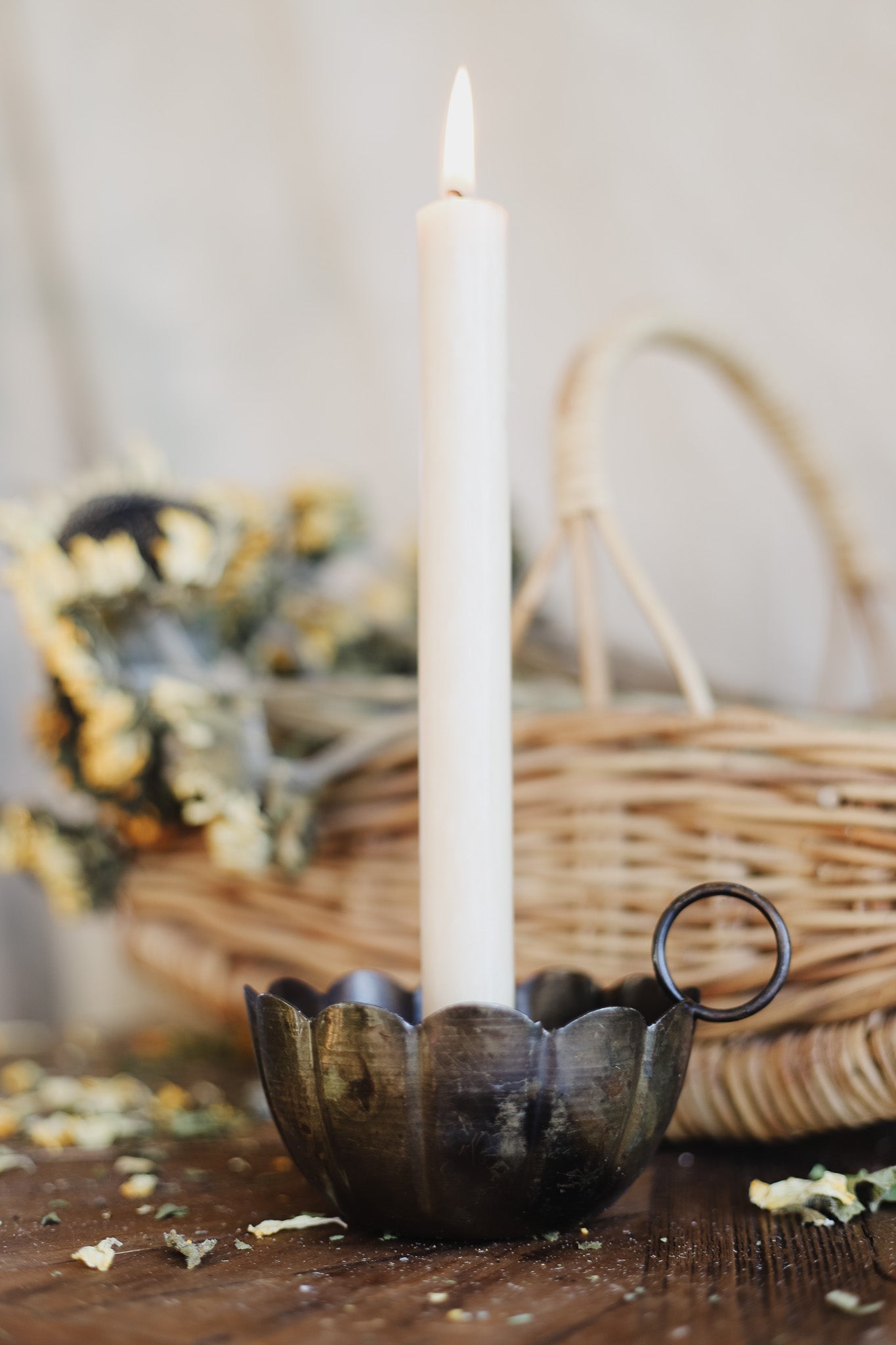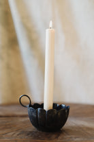 Absolutely darling handmade iron candle holder with scallop detail. Vintage esthetic makes you want to light a candle and curl up with your favorite book. The finger holder adds extra charm. One of our very best sellers!