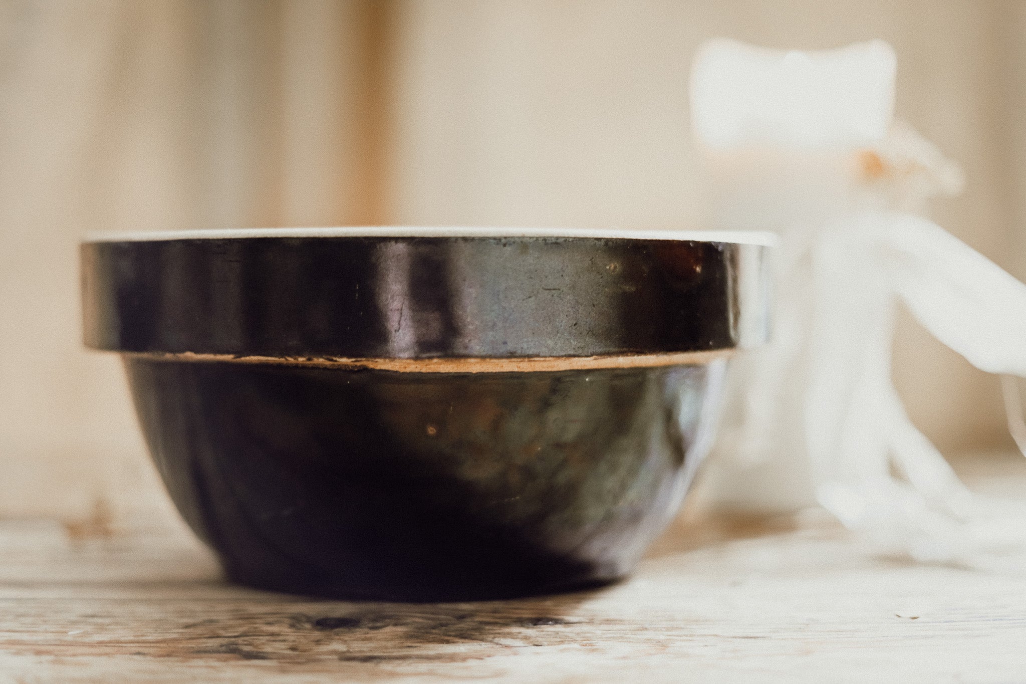 Rich in tone and rustic charm, this vintage stoneware bowl in a deep chocolate brown glaze reflects the simplicity and beauty of provincial life. Once used in the farmhouse kitchen for preparing or serving, its sturdy form and softly aged patina speak to both function and artistry. Perfect displayed among pottery, filled with fruit, or styled as a centerpiece, it is a soulful piece of American country décor — timeless, versatile, and full of character.